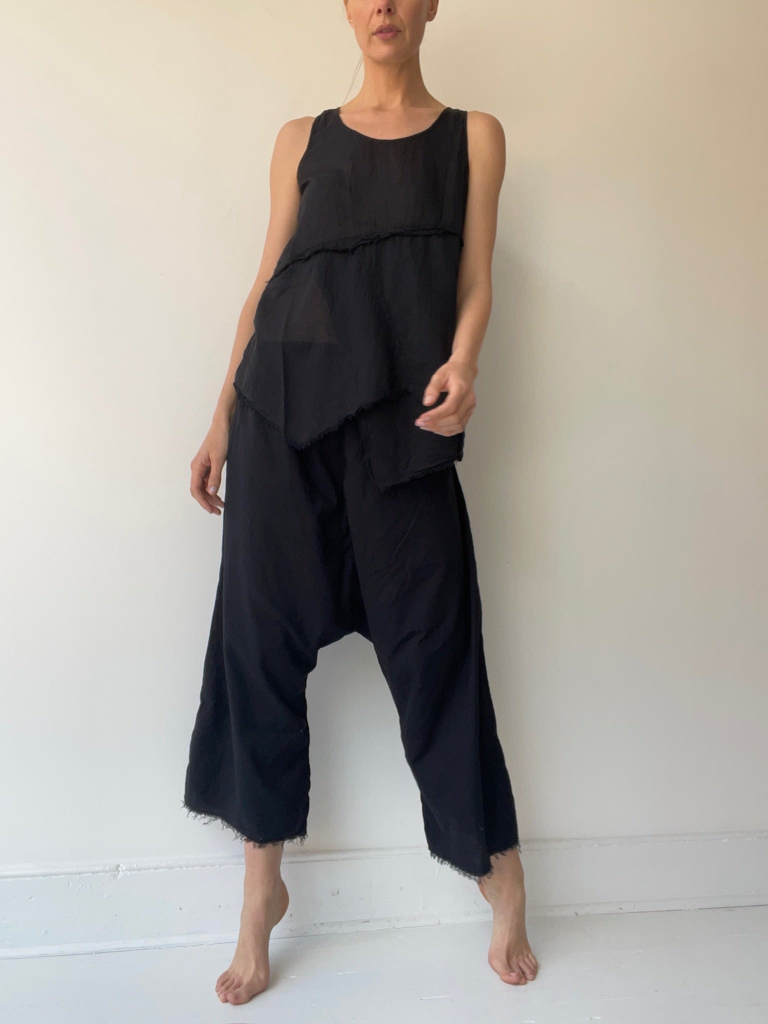 by pal offner, sheer asymmetrical top with staggered layers and fringed cut edges