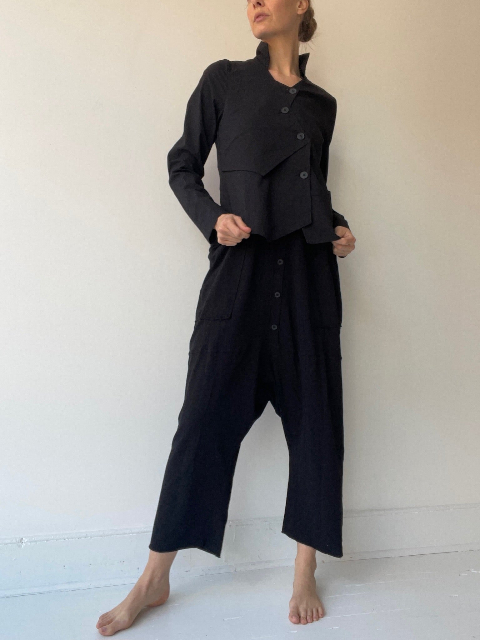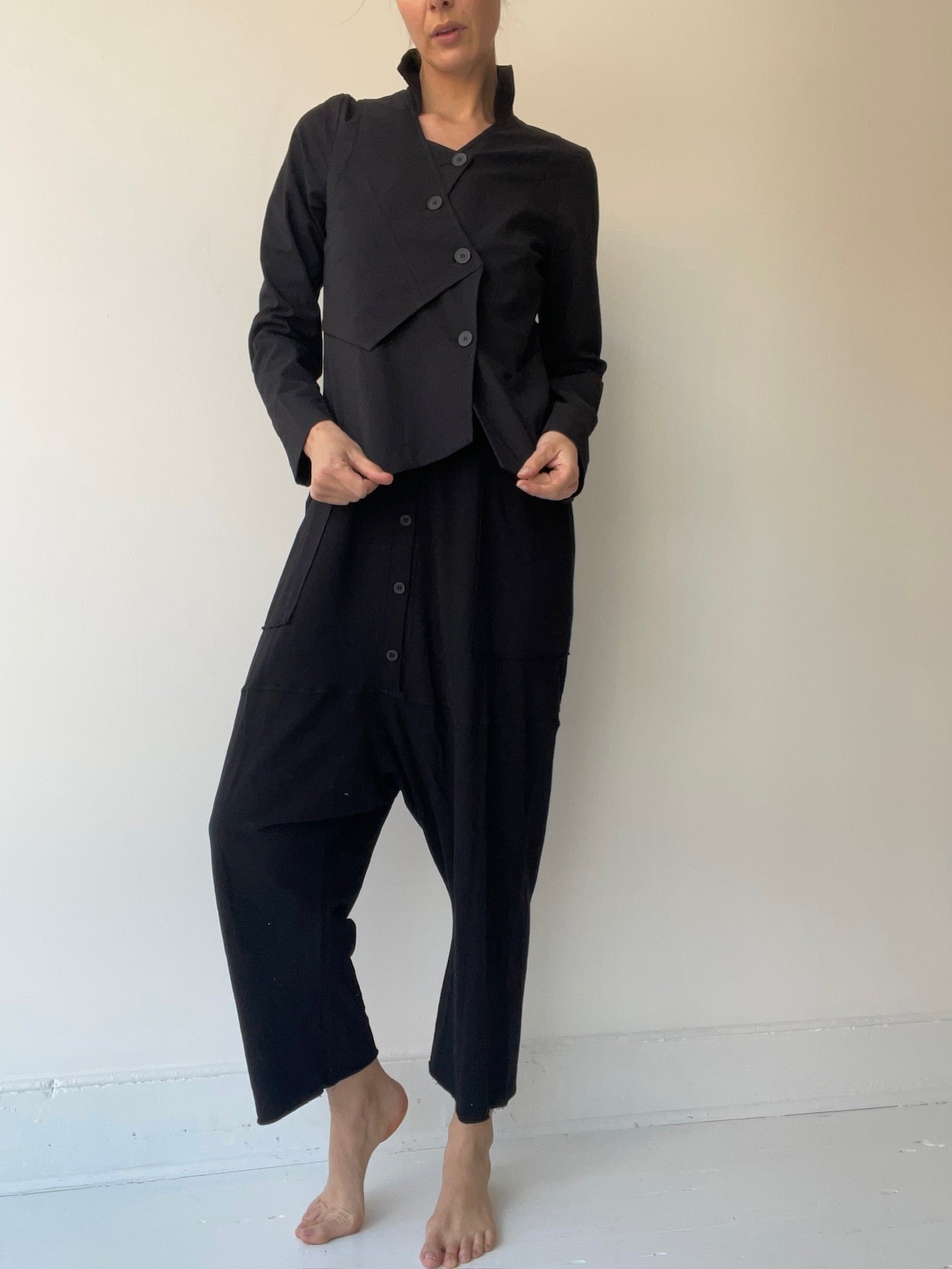 by pal offner, a short, slim fit lightweight jacket with asymmetrical button placket with offset buttons and a tapered layered look at the front