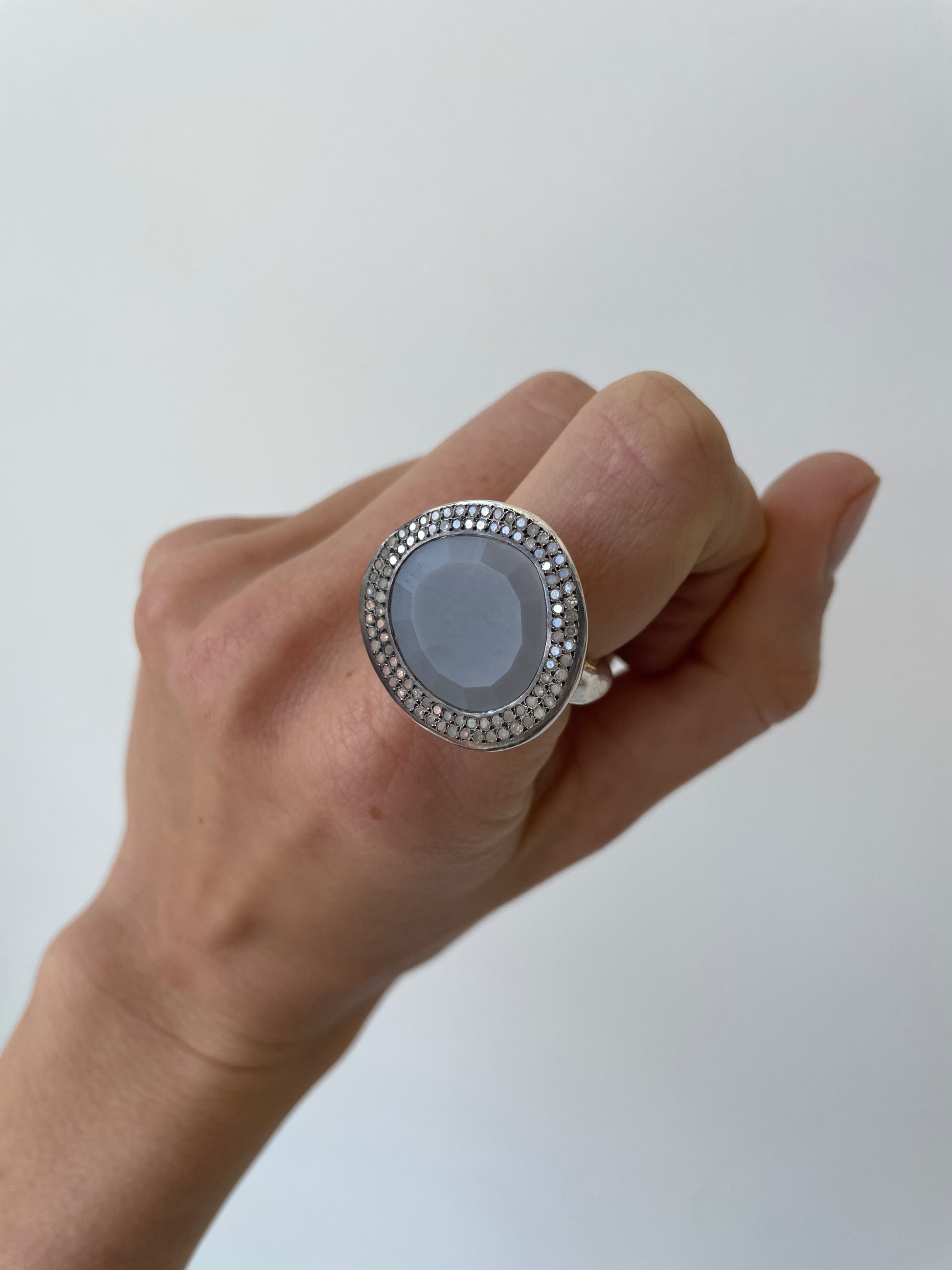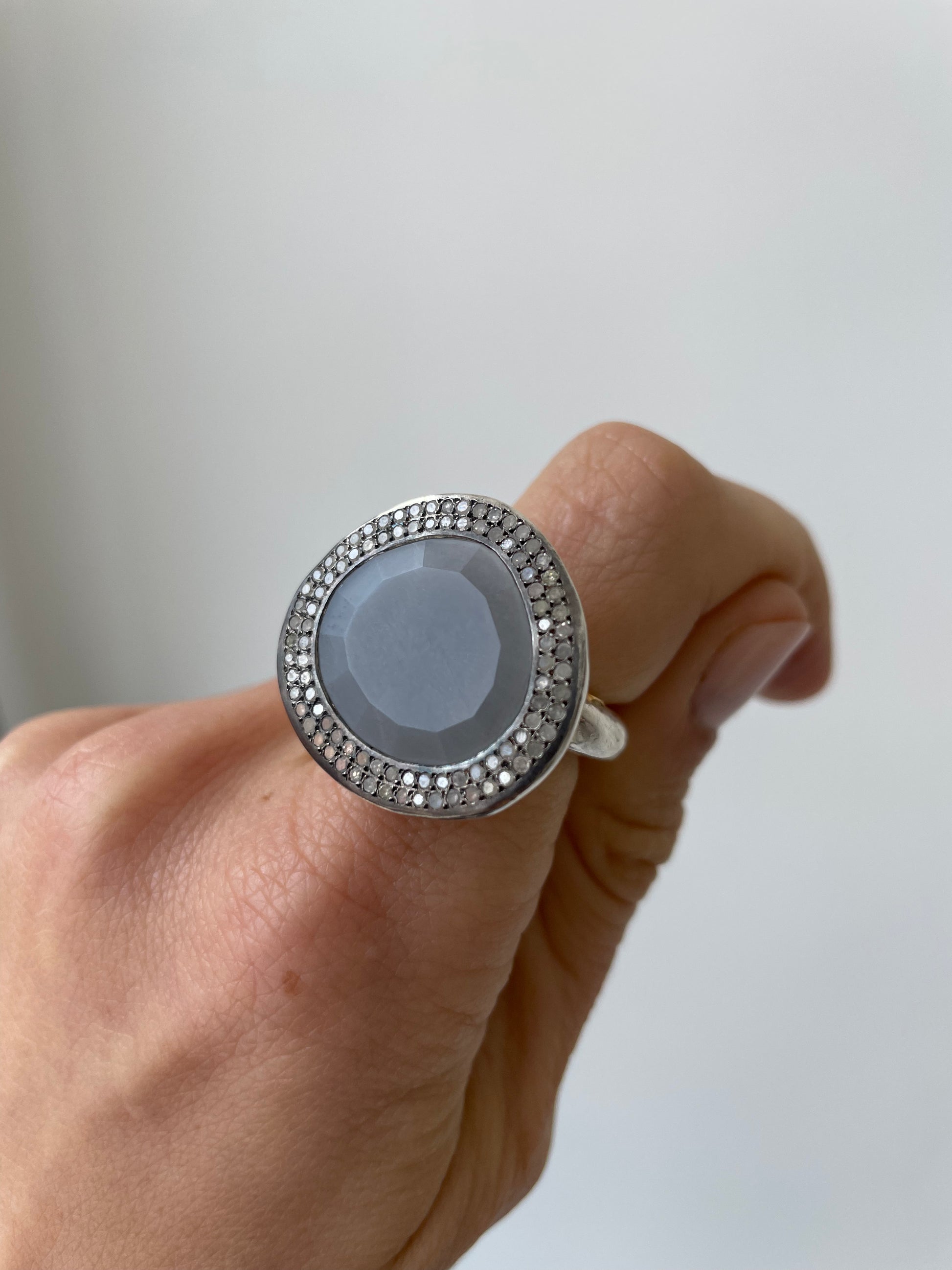 - sterling silver, 8 x 8 cut diamonds (1.06ct), grey moonstone (10.75ct)